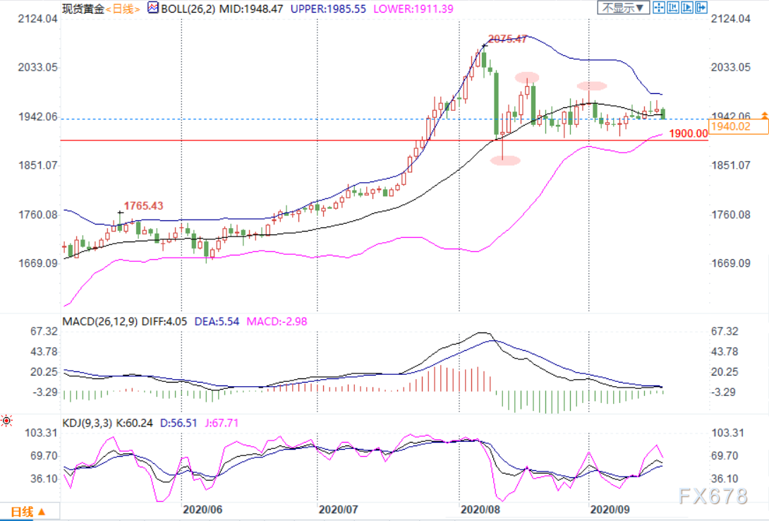 下方初步支撑先留意布林带下轨1911.04;强支撑重点关注1900关口,是重要防线。短期来看,预计该关口不会轻易跌破,但如果失守,可能回踩8月12日低点1863.16。