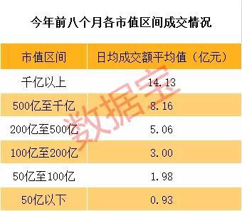 数据宝统计显示,今年以来成交额百强榜个股总成交额占全市场总成交额的比例达到53.91%,仅次于2018年,处于近5年来的次高点。以今年为例,市值在千亿市值的个股,今年前8月日均成交额平均值超过14亿元,而市值50亿元以下个股,日均成交额平均值不足亿元。
