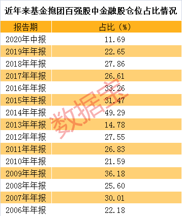 基金抱团股市盈率越来越高的背后,反映出低市盈率股票被抛弃。作为A股市场第一权重,以银行为首的金融股正逐渐退出基金重仓股幕后。数据宝统计显示,截至今年中报,基金重仓百强榜中,金融股(包括银行和非银金融)持仓市值占百强榜总市值的比例仅为11.69%,创出近15年来新低。在2014年,这一比例达到49.29%。