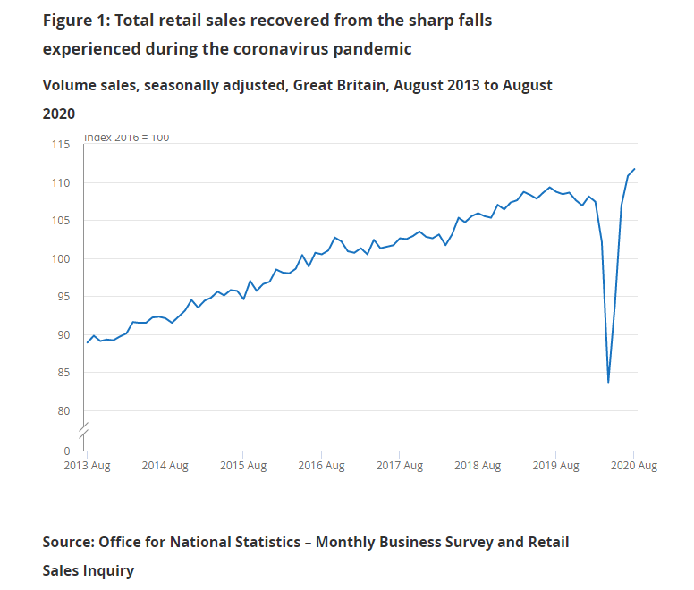 数据显示,与7月相比,8月的零售量增长了0.8%,比新冠疫情初期的2月份增长了4%,并且增长的势头持续。