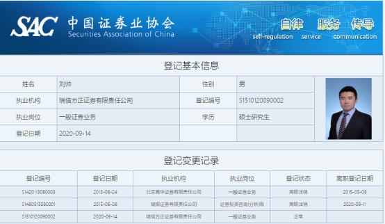 中证协信息显示,刘帅在2013年8月初次登记,执业机构为北京高华。此后,2015年8月,刘帅执业信息变更为瑞银证券,任职5年有余。今年9月,刘帅执业信息正式变更为瑞信方正证券。