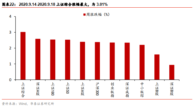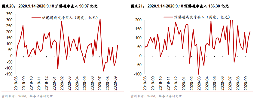 1)上周(9/14-9/18)全A资金净流出较前一周幅度收缩,主板/科创板资金净流入,中小板/创业板资金净流出但趋缓,创业板日成交额占全A比仍处在10年以来历史高位,但板块换手率回落至2.5%,接近注册制实施前水平。参照科创板经验,注册制施行一个月后换手率逐步回归历史中枢水平,预计创业板换手率仍将继续回落;2)两融余额上周环比增加42亿元,扭转上上周大幅回落趋势;3)8月底至9月中旬周度累计净流出的北向资金,上周大幅流入银行/医药/地产/汽车等行业,或受消费股PE TTM估值接近6月以来低位、富时罗素9月指数季度调整9/18盘后生效等因素影响。