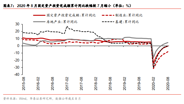 估值比较来看,上周五创业板/沪深300/纳斯达克指数/标普500估值PE TTM达历史(07年以来)83%/71%/99%/99%。分行业对比美股可比公司,A股金融、周期、部分消费板块相对低估。景气方面,9/15统计局公布数据显示:受房地产开发投资持续走强、制造业投资修复拉动,1-8 月城镇固定资产投资累计同比-0.3%,好于预期-0.4%(Wind一致预期),其中固定投资累计同比改善居前的制造业细分领域:黑色金属冶炼、机械设备修理、运输设备制造、医药制造、农副食品加工、纺织等,或对应出口、防疫需求持续。8月社零总额单月同比0.5%,年内首转正,消费需求回暖。
