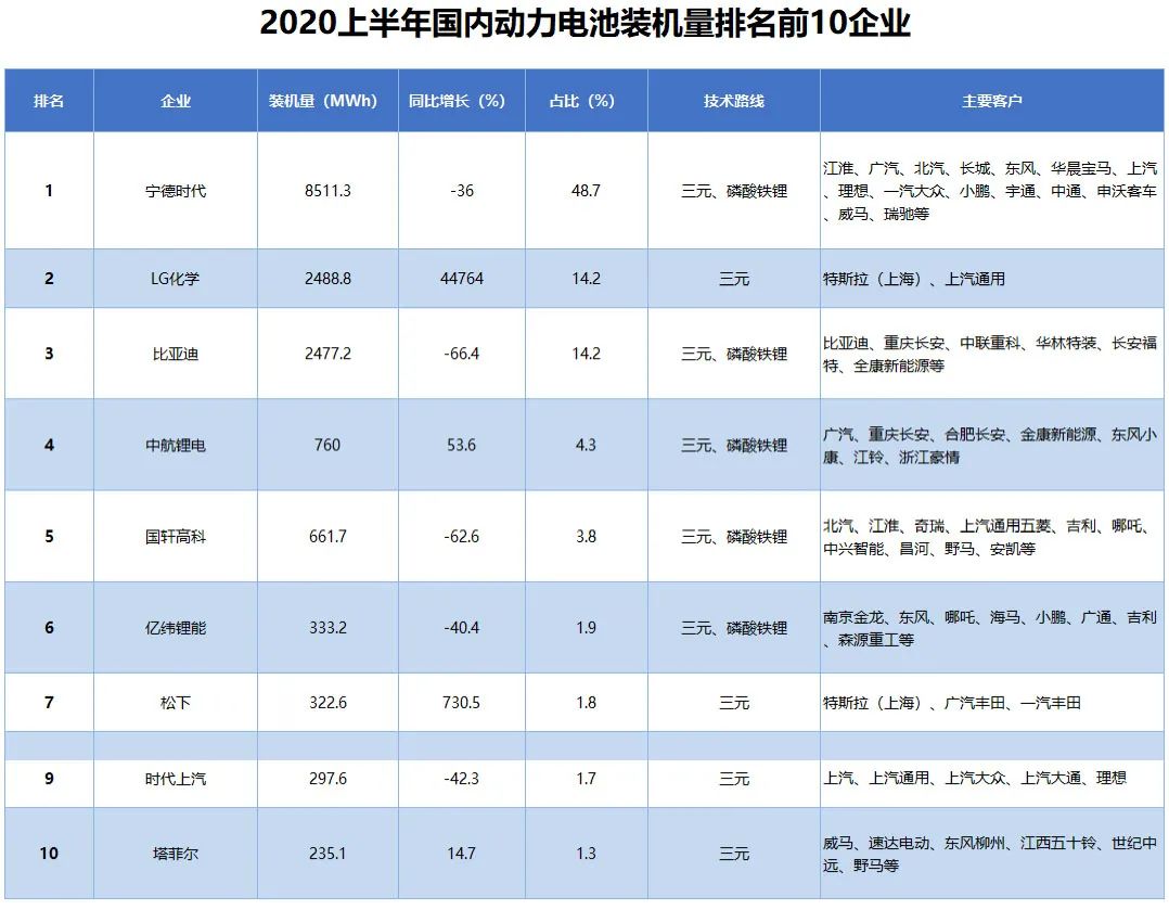 2020年上半年,LG化学的总装机量同比增长82.8%至10.5GWh,市场占有率达24.6%,而宁德时代总装机量同比下滑28.1%至10GWh,市场份额萎缩至23.5%。