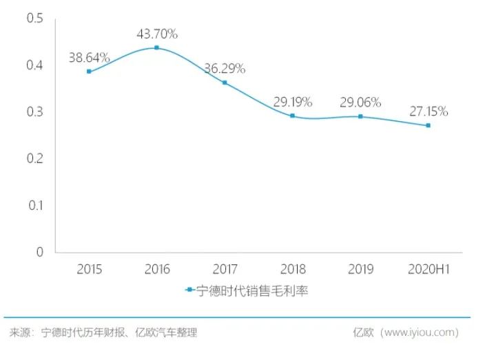 这是其毛利率逐年下降的路径选择结果。随着新能源车补贴政策逐渐退坡调整,整车企业在追求更高续航里程的同时,降低电池成本的诉求日益明显。自2016年起,宁德时代等国内主要动力电池企业的毛利率直线下降,由最初的近45%滑落至30%左右。而2020年上半年,宁德时代的销售毛利率仅为27.15%,呈继续下滑的态势。