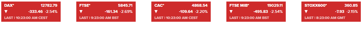 欧洲股市今天低开低走,主要股指跌幅早盘的大幅扩大,截至发稿,欧洲斯托克600指数跌2.2%,创7月30日以来的最大单日跌幅,德国DAX30指数、英国富时100指数、法国CAC40指数、意大利富时MIB指数分别下跌2.6%、2.7%、2.2%、2.5%。