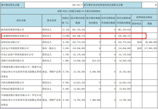 西部证券2020年半年度报告显示,截至2020年6月30日,公司第一大股东为陕西投资集团有限公司,期末持股数量为9.61亿股,持股比例为27.45%;第二大股东为城投控股,期末持股数量为5.28亿股,持股比例为15.09%;第三大股东为西部信托有限公司,期末持股数量为3.43亿股,持股比例为9.79%。