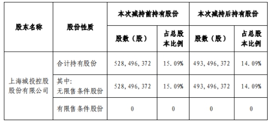 本次减持前,城投控股合计持有西部证券5.28亿股股份,占总股本比例15.09%;本次减持后,城投控股合计持有西部证券4.93亿股股份,占总股本比例14.09%。