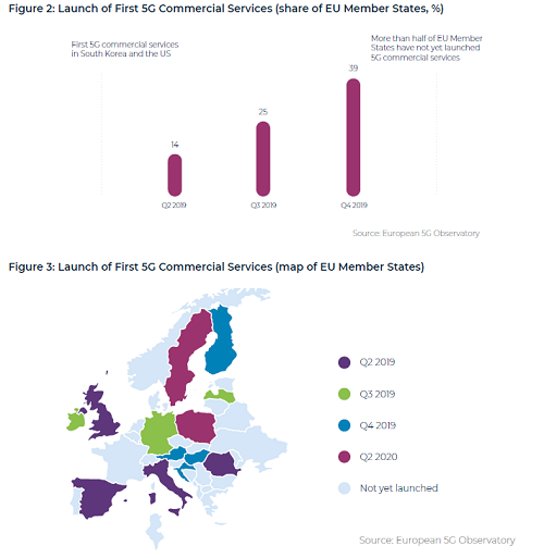 具体而言,在商业化领域中,有超过一半的欧盟成员国尚未启动5G商业服务,相比而言,一年前,韩国和美国就已经开始提供商业服务。
