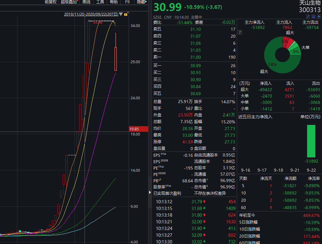 回溯原委,天山生物自8月下旬以来连续暴涨,累计涨幅已经接近5倍,被称为创业板改革后的“第一妖股”。公司在公告中多次提醒投资者“依法合规交易”,期间股票也曾临时停牌核查,但仍旧无法阻止股价暴涨,复牌后继续扶摇直上。