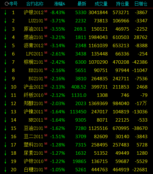 热点栏目9月22日,国内期市早盘大面积走跌,贵金属与能化品跌幅居前,沪银跌逾8%,沪金跌逾2%;低硫燃油、原油、燃油、沥青跌逾3%,乙二醇、甲醇跌逾2%;农产品飘绿,棕榈油跌逾2%,豆油跌近2%;涨幅方面,纯碱涨逾2%,鸡蛋涨逾1%。