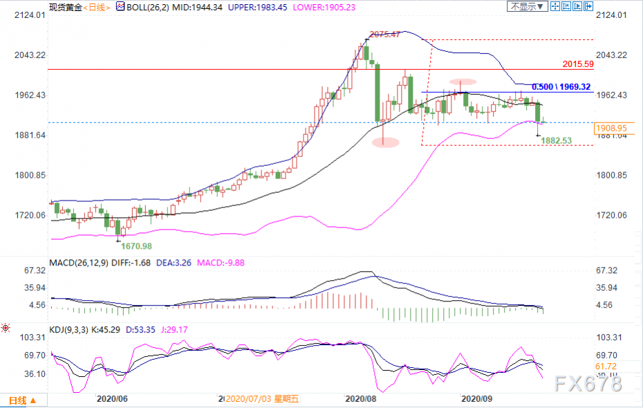 下方强支撑留意1900关口,只是近期重要的心理防线,金价前一交易日一度下破,随后再度拉起。需要注意,一旦金价彻底失守该关口,将提振市场看空情绪,进一步支撑下看前低1882.53。