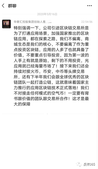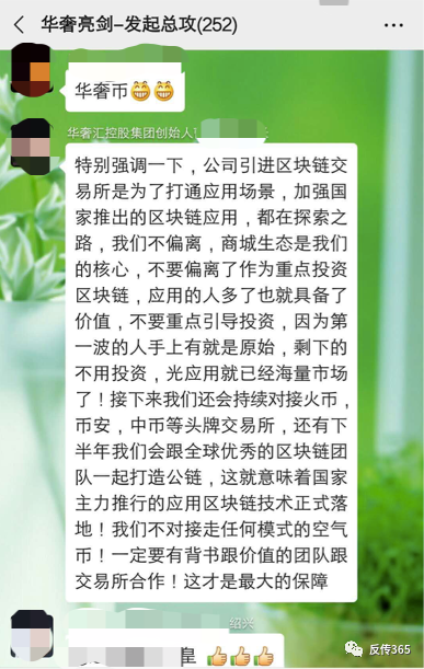 ◆图片来源:华奢汇商城会员提供当时还是有很多华奢汇商城的高层在微信群里为公司摇旗呐喊,积极宣扬公司对接的区块链虚拟币前途是多么多么的好。其实质还是为了拖延骗局彻底被揭发的时间。