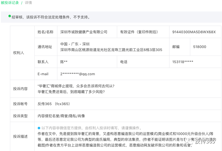 ◆图片来源:“天眼查APP”而早在2020年4月份本网就收到众多华奢汇商城会员的投诉讲述商城平台已经无法提现,当时反传销365网还下过一篇预警文章:“华奢汇”商城停止提现,众多会员该将何去何从?具体信息参看文章链接:https://mp.weixin.qq.com/s/92bkxYCormW780sH4crv_w,提示会员参与该平台涉及的风险并且希望他们能及时止损,但是还是由些会员不到黄河心不死的心理。