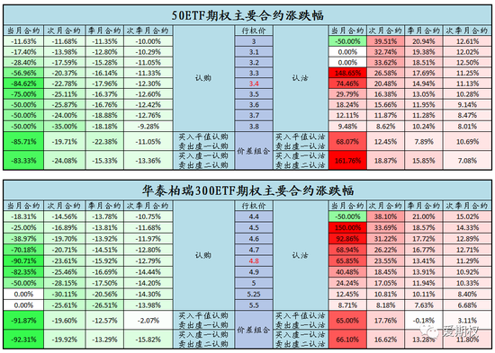 认沽普涨,认购普跌。今日在标的下跌行情下,认沽期权普遍上涨,临近到期的当月平值认沽期权涨幅最高,获接近翻倍收益;认购期权普遍下跌,当月合约价格大幅缩水。