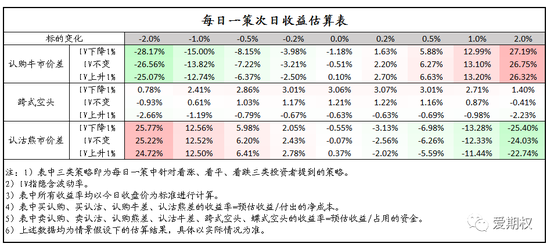 可以通过负vega策略布局波动率回落。认为市场波动将逐渐降低的投资者可以通过跨式空头、宽跨式空头等负vega策略布局隐含波动率回落。在目前隐含波动率相对偏高的环境下,相应的获利空间和获利机会比较大。不过也有两点需注意,其一仓位不要过重,虽然隐含波动率已经较高,但并不意味着未来隐含波动率就不会再上涨了。如果仓位太满,很可能在一次波动中导致保证金不足从而遭受损失。其二要做好注意做好风控措施,做好出现极端行情该怎么办的打算。