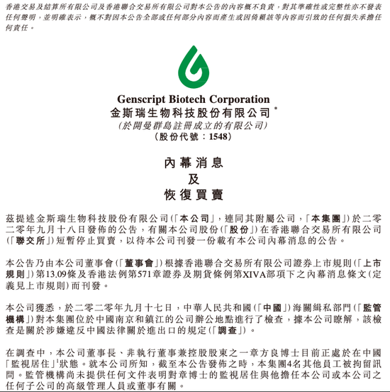 昨日(9月21日)晚间,国内知名生物科技上市公司金斯瑞生物科技(以下简称“金斯瑞”)发布公告称,因受相关部门调查,公司董事长、非执行董事兼控股股东之一章方良博士目前正处于“监视居住”状态,集团4名其他员工被拘留讯问。