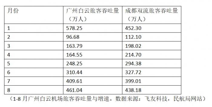7月,头名易主,当月广州以409.61万人的旅客吞吐量,反超成都约10万人,成为国内城市中繁忙度第一的机场。