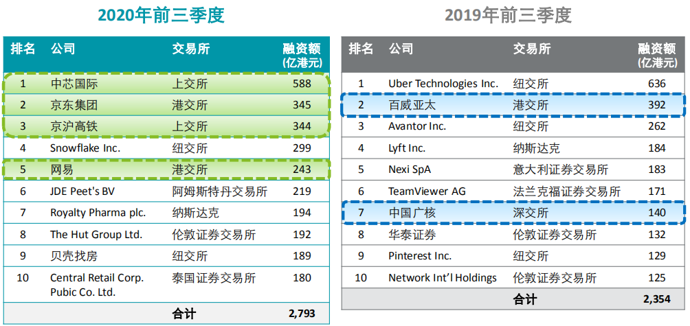 今年前三季度全球前十大新股融资额榜单中有四只来自上交所和港交所,且占据了榜单前三名席位。这四家公司分别为中芯国际(688981.SH)、京东集团(9618.HK)、京沪高铁(601816.SH)和网易(9999.HK)。