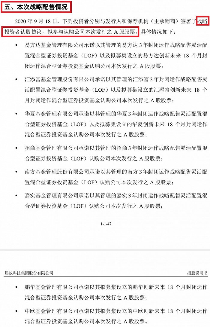 但值得注意的是,9月22日晚间,蚂蚁集团向上交所递交的招股说明书(注册稿)显示,除了上述5只18个月封闭运作的混合型基金外,之前发布的6只3年封闭运作战略配售灵活配置基金,也参与此次战略配售。