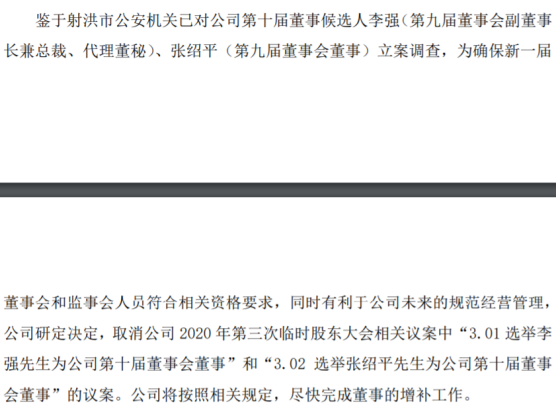 中证君注意到,同日晚间,公司公告称,鉴于射洪市公安机关已对公司第十届董事候选人李强、张绍平立案调查,为确保新一届董事会和监事会人员符合相关资格要求,同时有利于公司未来的规范经营管理,公司研定决定,取消公司2020年第三次临时股东大会相关议案中“选举李强为公司第十届董事会董事”和“选举张绍平为公司第十届董事会董事”的议案。公司将按照相关规定,尽快完成董事的增补工作。