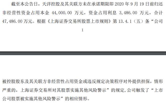 9月20日晚,舍得酒业公告称,因天洋控股及其关联方未在承诺期限即9月19日前归还非经营性资金占用本金4.4亿元,资金占用利息3486万元,合计4.75亿元,根据相关规定,公司触发了“上市公司股票被实施其他风险警示”的相应情形。公司股票将于9月21日停牌1天,9月22日起实施其他风险警示,实施其他风险警示后股票价格的日涨跌幅限制为5%。实施风险警示后公司股票将在风险警示板交易。