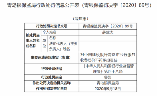 9月27日消息,青岛银保监局公布的行政处罚信息公开表显示,中国建设银行股份有限公司青岛市分行因服务收费质价不符、向个人唯一账户收取账户管理费,被处罚款65万元。同时,相关责任人薛建忠对中国建设银行青岛市分行服务收费质价不符承担责任,受到警告处分。