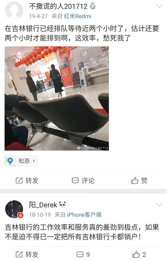 行长助手注意到,此次也并非吉林银行首次在微博上被吐槽网点工作效率低下。有网友更是感叹道,“这样的效率,迟早会被行业淘汰啊!”