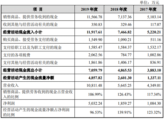 2017年-2019年,尚沃医疗营业收入分别为4349.01万元、5645.25万元、10811.48万元,归属于母公司所有者的净利润分别为1084.30万元、1859.27万元、4957.22万元。销售商品、提供劳务收到的现金分别为5103.14万元、7137.36万元、11566.78万元,经营活动产生的现金流量净额分别为1337.11万元、2601.30万元、4857.82万元。