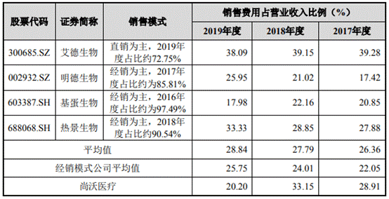 “发行人产品在国内尚处于市场推广阶段,终端医院使用习惯尚在培育,且发行人产品专业性较强,因此相比经销模式为主的可比公司,发行人需要更多的自主推广投入,2017年及2018年销售费用率高于可比公司平均值。”尚沃医疗方面解释称。