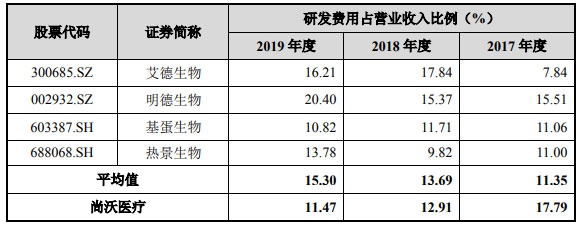 尚沃医疗招股书称,2017年度公司研发费用占营业收入的比例显著高于同行业可比公司平均值,主要由于2017年度公司营业收入基数较小所致。2018年公司研发费用占营业收入的比例与同行业可比公司不存在显著差异。2019年尽管公司研发费用增加,但由于营业收入大幅增长,因此研发费用占营业收入的比例下降,并低于可比公司。