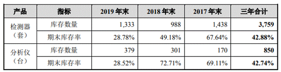2017年-2019年,公司前十大经销商分析仪期末库存数量分别为170台、301台、379台,三年合计850台;期末库存率分别为69.11%、72.71%、28.52%,三年合计期末库存率为42.74%。