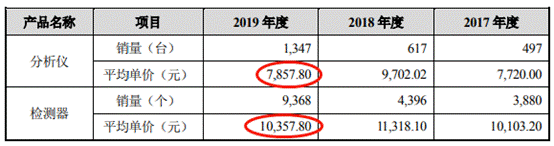 2017年-2019年,公司检测器的平均销售单价分别为10103.20元、11318.10元、10357.80元;呼气分子诊断仪器的平均销售单价分别为7720.00元、9702.02元、7857.80元。