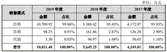 各期,尚沃医疗95%以上的主营业务收入来源于经销收入。2017年-2019年,经销收入占公司主营业务收入的比例分别为95.93%、95.45%、99.06%。