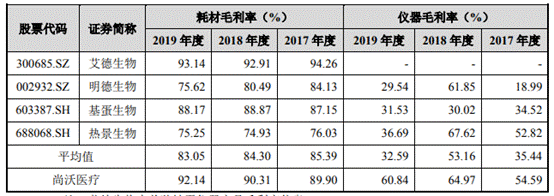 尚沃医疗表示,报告期内,公司耗材及仪器毛利率高于可比公司平均值,2019年耗材毛利率与艾德生物相当。公司产品毛利率较高主要由于:一、公司所处行业为体外诊断行业,主要产品为呼气分子诊断产品,技术壁垒较高,行业毛利率高;二、由于公司产品在呼气分子诊断领域处于市场领先地位,产品质量稳定,具有一定的技术优势;三、随着FeNO行业指南和专家共识的形成,公司产品临床产品认可度有所提升。综上高,且公司产品具有较强的技术壁垒,因此,公司产品得到终端用户认可,具有一定的品牌溢价较为明显,毛利率较高。