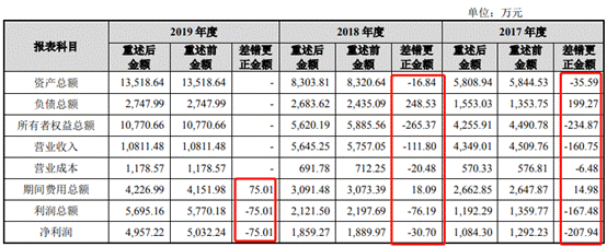 上述会计差错更正使得公司2017年、2018年资产总额分别调减35.59万元、16.84万元;负债总额分别调增199.27万元、248.53万元;所有者权益总额分别调减234.87万元、265.37万元;营业收入分别调减160.75万元、111.80万元;营业成本分别调减6.48万元、20.48万元。2017年、2018年、2019年净利润分别调减207.94万元、30.70万元、75.01万元。