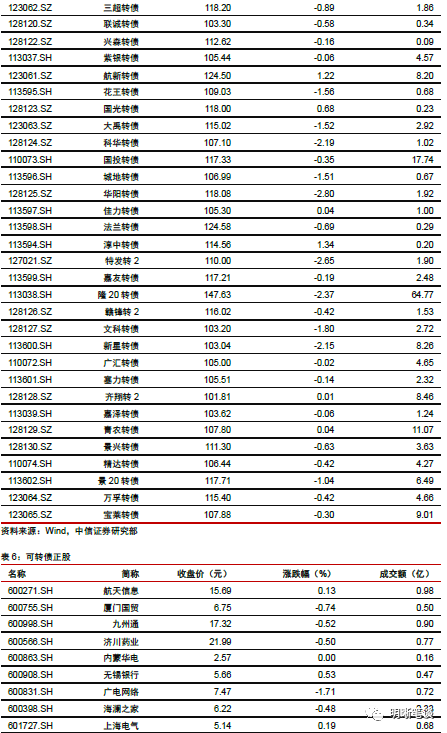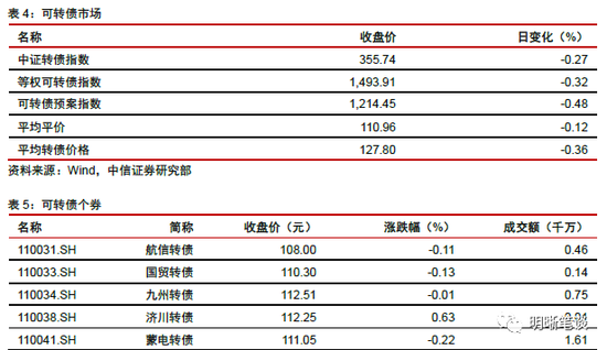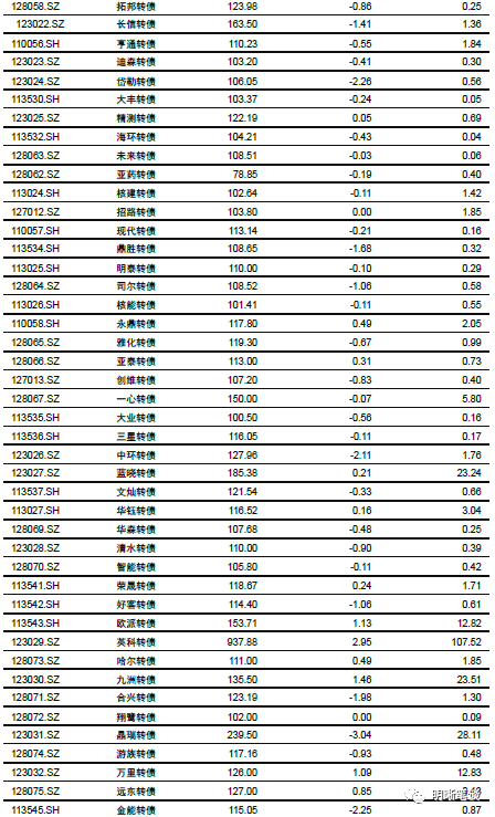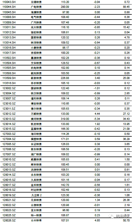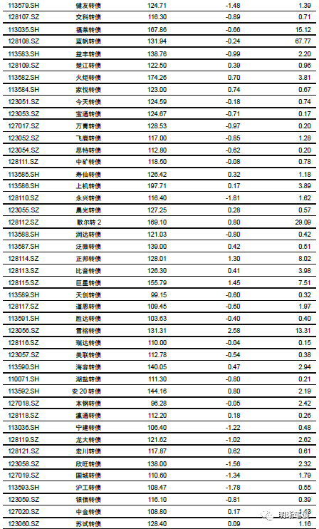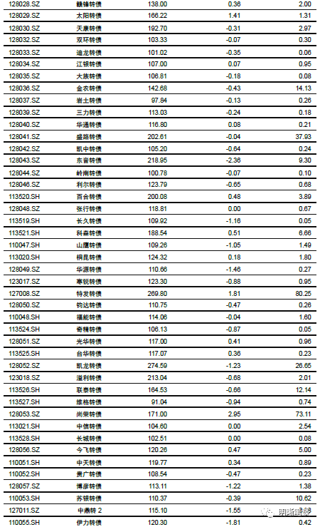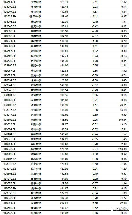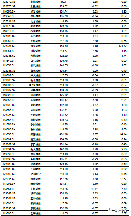 9月25日转债市场,中证转债指数收于355.74点,日下跌0.27%,等权可转债指数收于1,493.91点,日下跌0.32%,可转债预案指数收于1,214.45点,日下跌0.48%;平均平价为110.96元,日下跌0.12%,平均转债价格为127.80元,日下跌0.36%。299支上市可交易转债(辉丰转债除外),除新北转债、招路转债、长城转债、中信转债、海澜转债、翔鹭转债、永东转债和张行转债横盘外,83支上涨,208支下跌。其中众兴转债(4.65%)、万顺转债(4.44%)和新泉转债(3.40%)领涨,正裕转债(-12.11%)、横河转债(-5.34%)和龙蟠转债(-4.19%)领跌。295支可转债正股(*ST辉丰除外),除青农商行、嘉泽新能、联创电子、天汽模、淮北矿业、迪贝电气、荣晟环保、雅化集团、中鼎股份、张家港行、苏农银行、杭电股份、光大银行和内蒙华电横盘外,111支上涨,170支下跌。其中众兴菌业(9.95%)、兄弟科技(8.19%)和尚荣医疗(7.00%)领涨,正裕工业(-10.02%)、翔港科技(-5.08%)和起步股份(-4.66%)领跌。