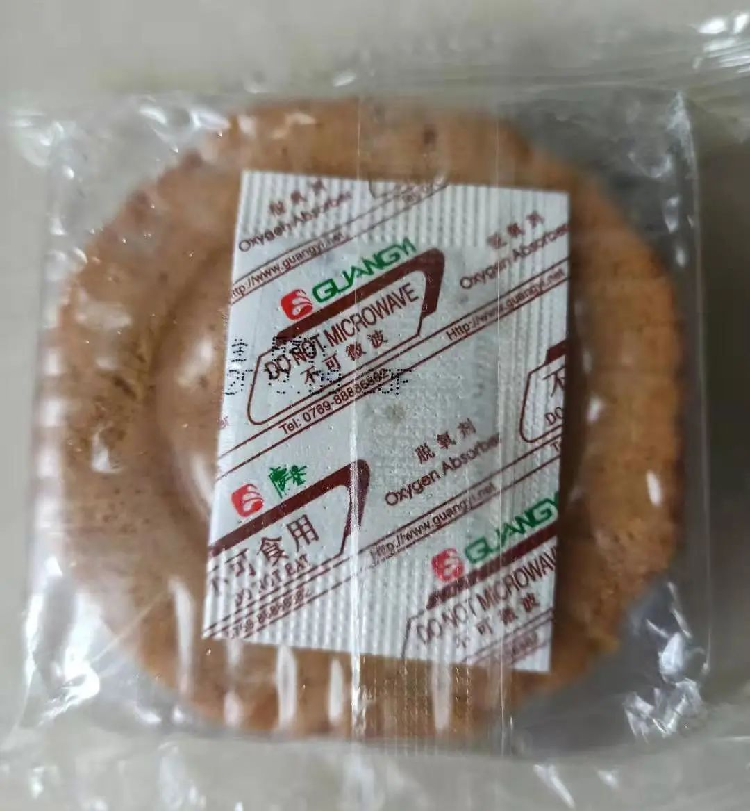 透过塑料包装,帮忙君看到,里面是一个方形的“胚芽白莲”月饼。从背面看,塑料小包装内还有一个标注“不可食用”的脱酸素剂。