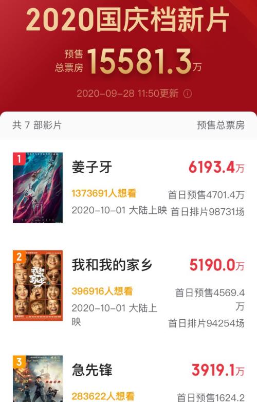 猫眼专业版显示,截至9月28日11点50分,国庆档影片预售总票房接近1.6亿元,其中,《姜子牙》《我和我的家乡》占了超过70%,预售票房分别为6195万元、5190万元。