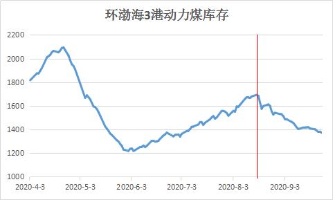 截止上周,环渤海3港动力煤库存已经降至1371.3万吨,较8月中旬高位减少近两成,五港库存合计不足1800万吨,但仍略高于去年同期。