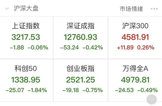 截至收盘,沪指微跌0.06%报3217.53点,深成指跌0.42%,创业板指跌0.75%,创业板综指跌1.26%,科创50指数大跌近2%。两市仅成交5403亿元,较上周大幅萎缩。
