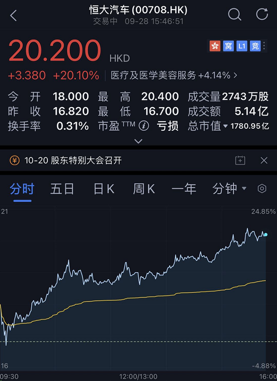 其中,中国恒大暴涨22%,恒大汽车暴涨20%、
