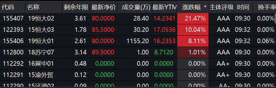 恒大债集体反弹,19恒大02涨超21%,15恒大03涨超10%,19恒大01涨超8%。