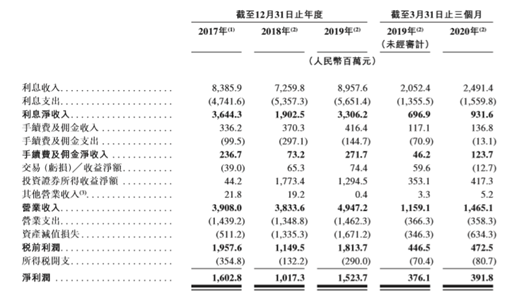 2017年至2019年,威海银行的营收分别为39.08亿元、38.33亿元和49.47亿元;净利润则分别为16.02亿元、10.17亿元和15.23亿元。资产总额分别约为2044亿元、2031亿元和2246亿元;负债总额则分别约为1934亿元、1893亿元和2067亿元。此外,威海银行的营业收入很大程度上取决利息净收入。2017-2019年度,利息净收入占营业总收入的比重为93.3%、49.6%及66.8%。