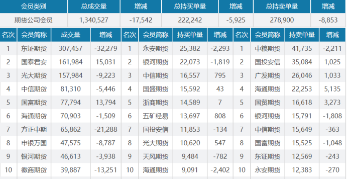 从成交明细可以看出,东证期货席位成交量为307457手,国泰君安席位为161984手,光大期货席位为157984手,当日期货公司会员全部成交量为2681054手(双边),上述三家期货公司分别占总成交量的11.5%、6%和5.9%,三家合计占比为23.4%。