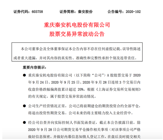 9月28日晚,秦安股份在股票交易异常波动公告中表示,经公司自查并向实际控制人书面发函查证,截止本公告披露日前,除2020年9月28日公司期货交易平仓操作相关事项(对该事项公司严格做好信息保密,并做好内幕信息知情人登记工作,在盘后及时提交相关公告)外,不存在其他影响股价异常波动的重大事项,不存在应披露而未披露的重大信息。
