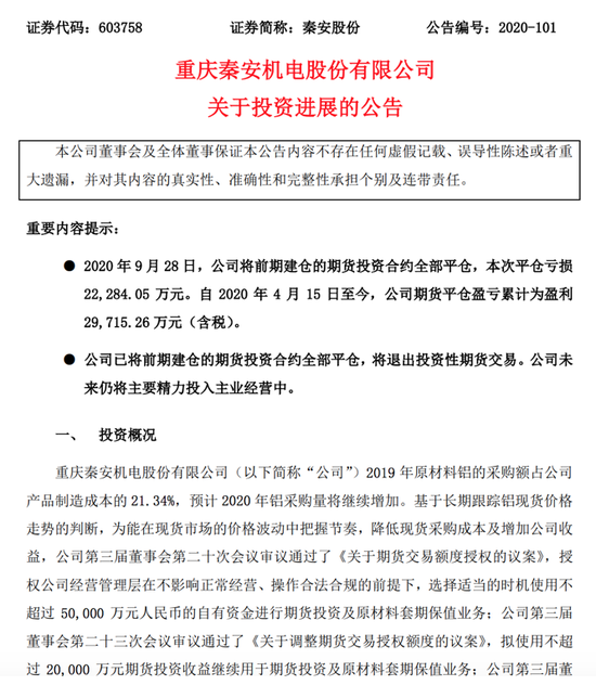 28日晚间,秦安股份再次发布投资进展公告,2020年9月28日,公司将前期建仓的期货投资合约全部平仓,本次平仓亏损22284.05万元。自2020年4月15日至今,公司期货平仓盈亏累计为盈利29715.26万元(含税)。