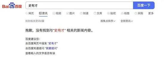 当新闻在网上扩散时,有人发现,百度疑似屏蔽了与史有才相关的资讯。