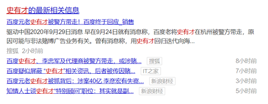 史有才被警方带走的消息最早在9月24日传出,当时,百度回应不予置评。