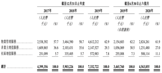 从三大主营业务收入来看,物业管理服务仍是恒大物业的核心收入来源。截至上半年,物业管理服务收入为28.24亿港元,占比高达61.9%;其次是非业主增值服务收入12.31亿港元,占比27%;以及社区增值服务5.08亿港元,占比11.1%。